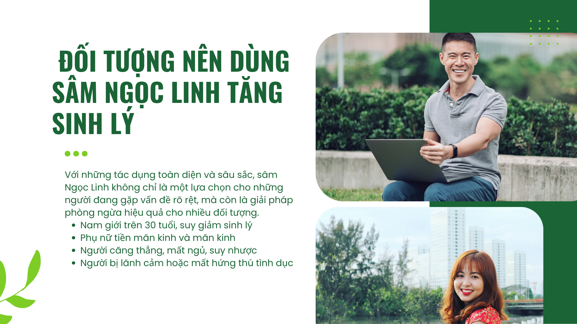 Dưới đây là những nhóm người được khuyến nghị nên sử dụng sâm Ngọc Linh để cải thiện và duy trì sức khỏe sinh lý.