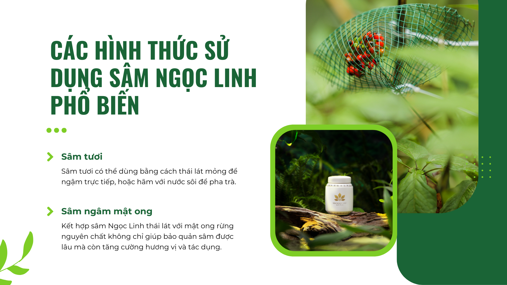 Sâm Ngọc Linh có thể được chế biến và sử dụng dưới nhiều hình thức khác nhau, phù hợp với nhu cầu và sở thích của từng người: