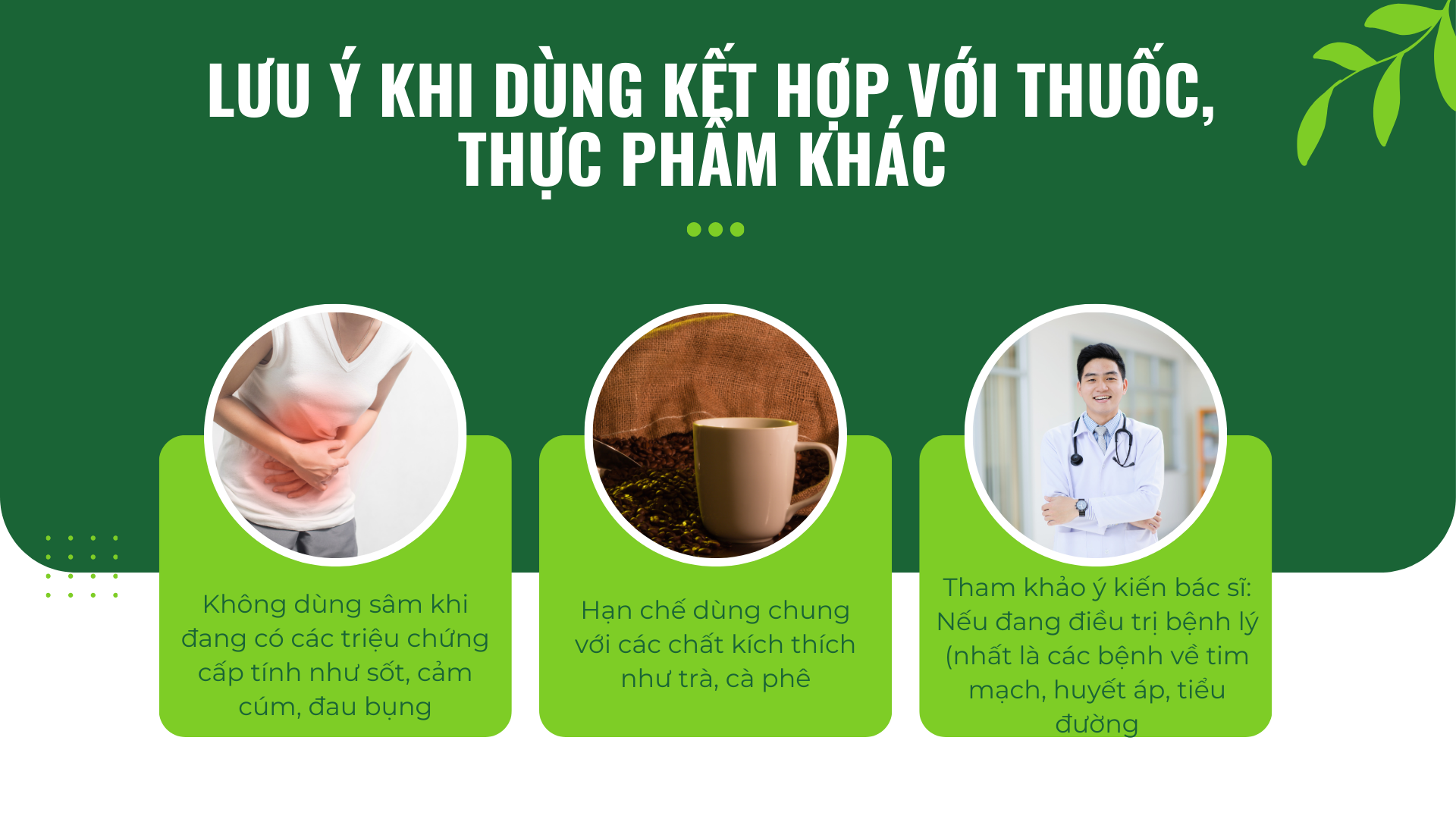 Hạn chế dùng chung với các chất kích thích: Tránh dùng chung sâm với cà phê, trà đậm, hoặc các loại chất kích thích khác vì có thể gây ra hiện tượng bồn chồn, tim đập nhanh hoặc mất ngủ.
