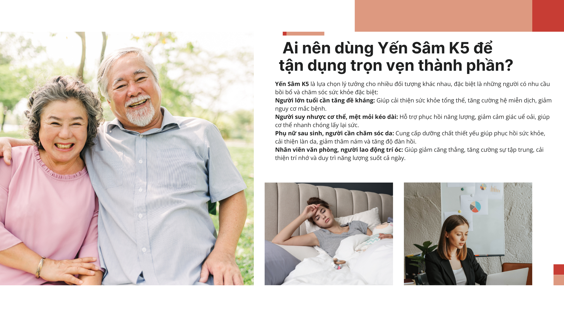 Yến Sâm K5 là lựa chọn lý tưởng cho nhiều đối tượng khác nhau, đặc biệt là những người có nhu cầu bồi bổ và chăm sóc sức khỏe đặc biệt: