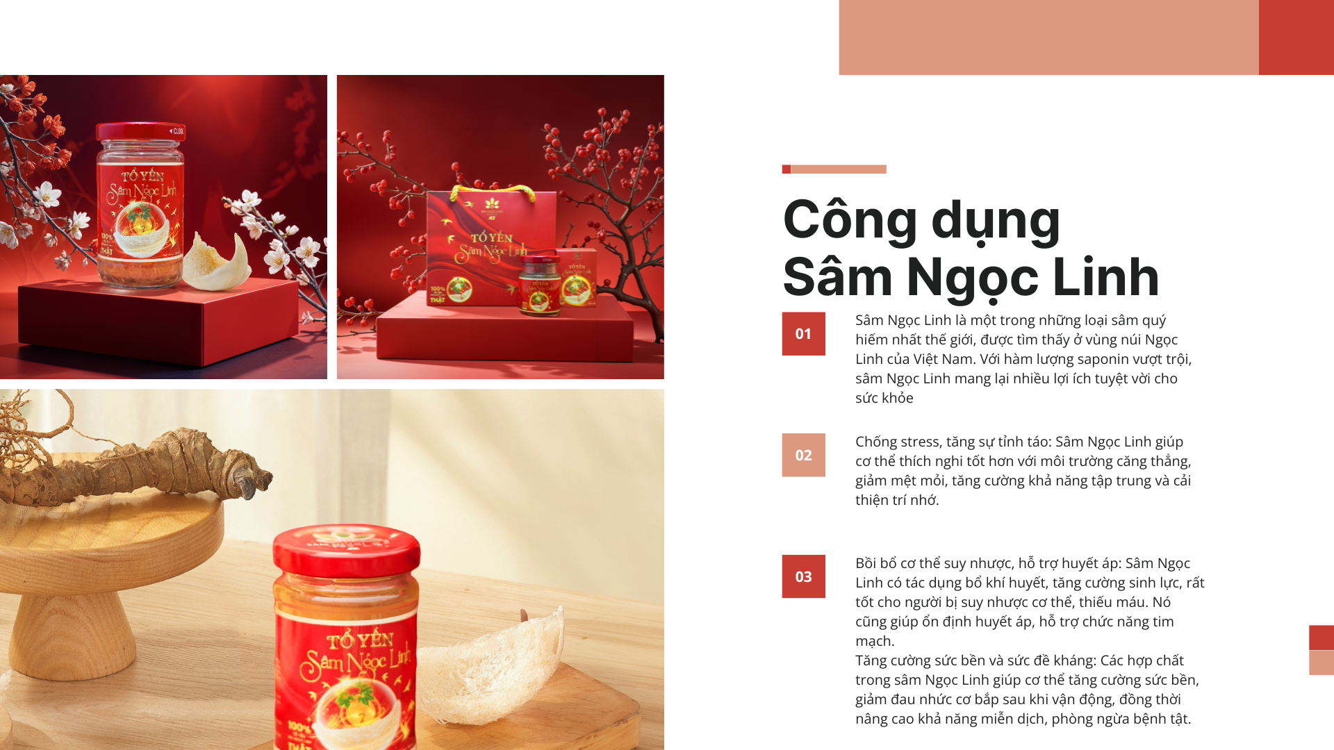Tác động đồng thời lên sức khỏe, làn da và tinh thần: Trong khi tổ yến tập trung vào việc bồi bổ dinh dưỡng, tăng cường miễn dịch và làm đẹp da, sâm Ngọc Linh lại chú trọng vào việc tăng cường năng lượng, giảm căng thẳng và cải thiện chức năng thần kinh. Sự kết hợp này mang lại hiệu quả tổng thể, giúp bạn khỏe mạnh từ bên trong ra bên ngoài.