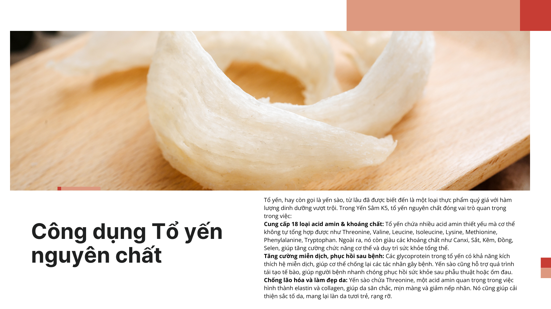 Tổ yến, hay còn gọi là yến sào, từ lâu đã được biết đến là một loại thực phẩm quý giá với hàm lượng dinh dưỡng vượt trội. Trong Yến Sâm K5, tổ yến nguyên chất đóng vai trò quan trọng trong việc: