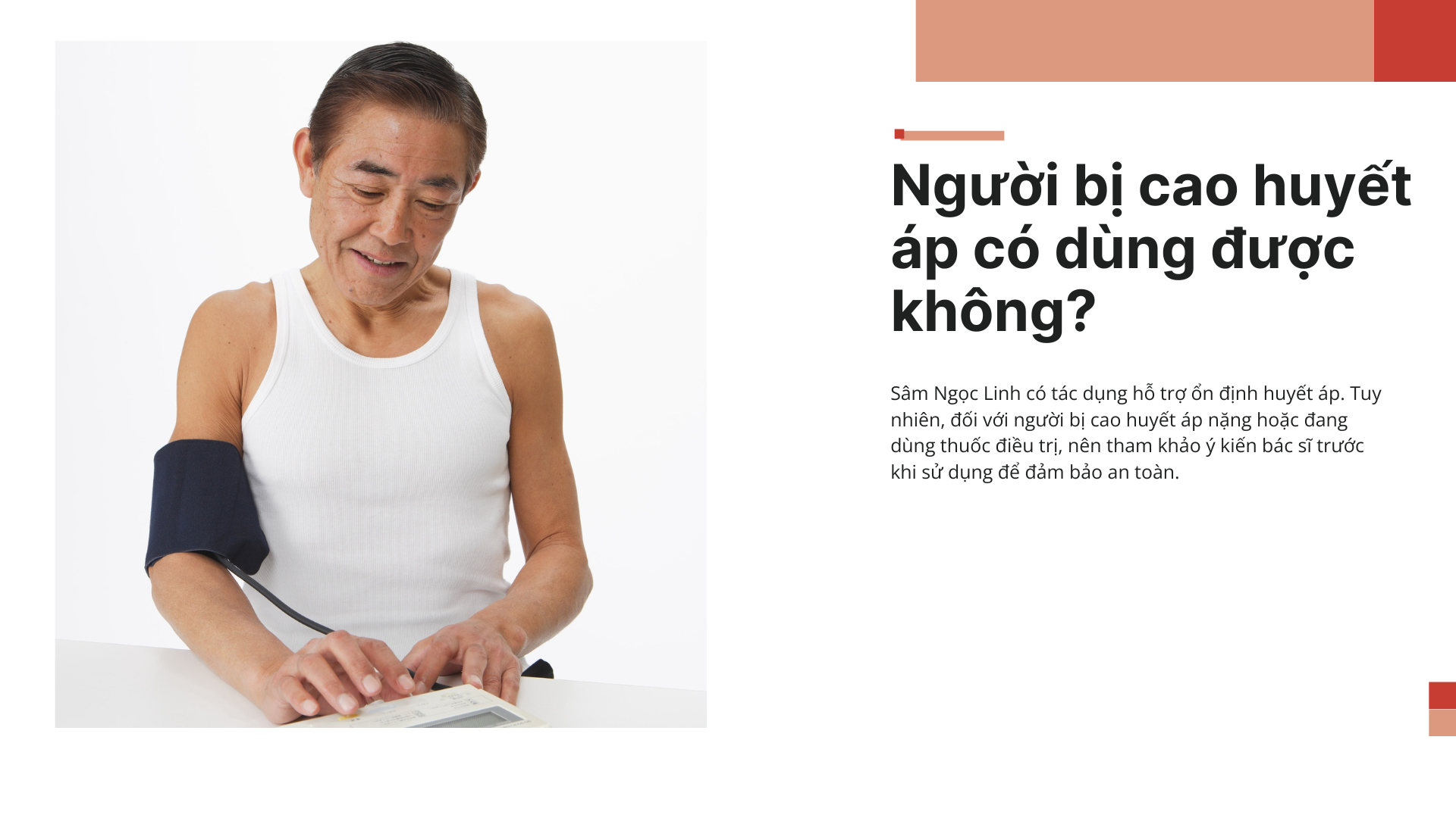 Sâm Ngọc Linh có tác dụng hỗ trợ ổn định huyết áp. Tuy nhiên, đối với người bị cao huyết áp nặng hoặc đang dùng thuốc điều trị, nên tham khảo ý kiến bác sĩ trước khi sử dụng để đảm bảo an toàn.