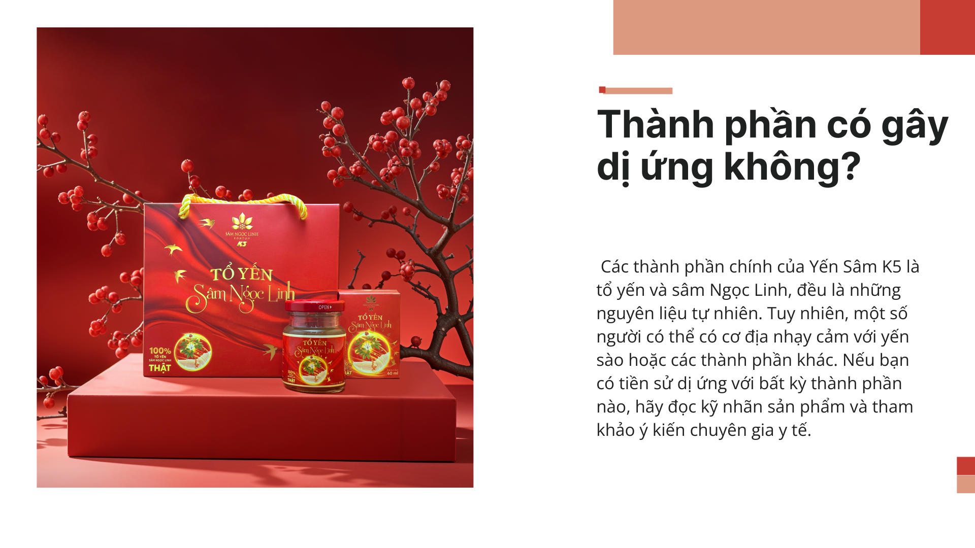 Các thành phần chính của Yến Sâm K5 là tổ yến và sâm Ngọc Linh, đều là những nguyên liệu tự nhiên. Tuy nhiên, một số người có thể có cơ địa nhạy cảm với yến sào hoặc các thành phần khác. Nếu bạn có tiền sử dị ứng với bất kỳ thành phần nào, hãy đọc kỹ nhãn sản phẩm và tham khảo ý kiến chuyên gia y tế.