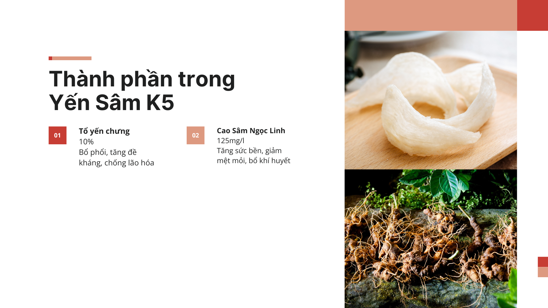 Yến Sâm K5 với sự kết hợp hoàn hảo của tổ yến nguyên chất và sâm Ngọc Linh quý hiếm, mang đến giải pháp toàn diện cho sức khỏe, sắc đẹp và tinh thần. Việc hiểu rõ từng thành phần sẽ giúp bạn tận dụng tối đa những giá trị mà sản phẩm mang lại.