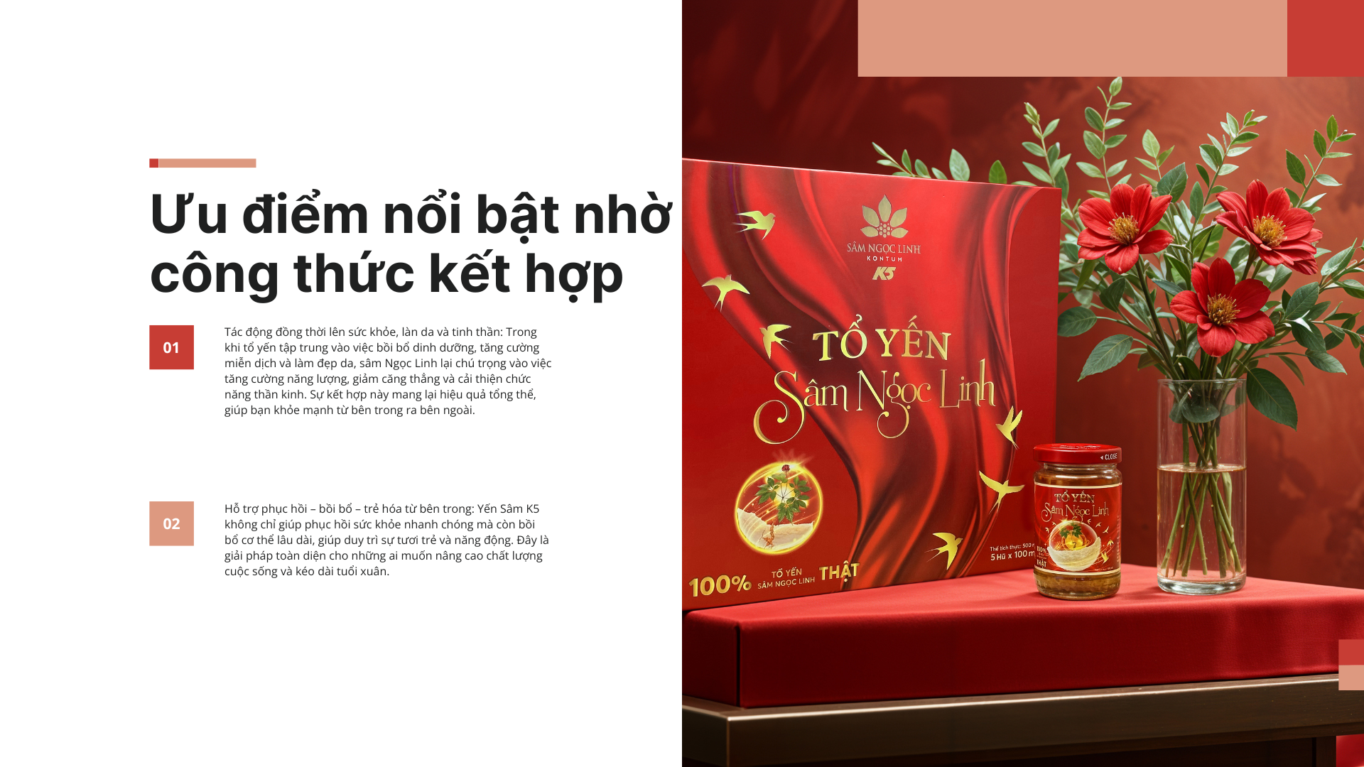 Sự kết hợp hoàn hảo giữa tổ yến và sâm Ngọc Linh trong Yến Sâm K5 tạo nên một công thức bồi bổ sức khỏe toàn diện, mang lại những ưu điểm vượt trội:
