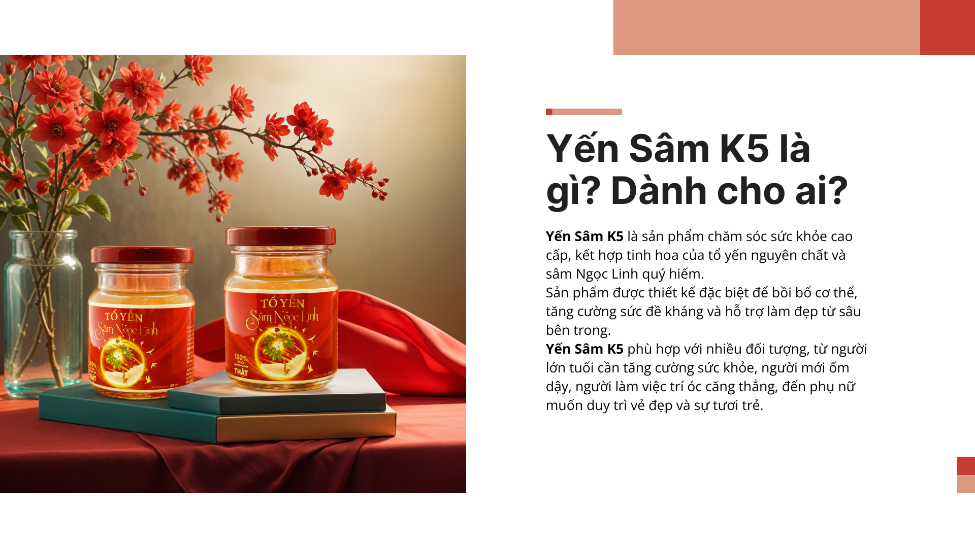 Yến Sâm K5 là sản phẩm chăm sóc sức khỏe cao cấp, kết hợp tinh hoa của tổ yến nguyên chất và sâm Ngọc Linh quý hiếm. Sản phẩm được thiết kế đặc biệt để bồi bổ cơ thể, tăng cường sức đề kháng và hỗ trợ làm đẹp từ sâu bên trong. Yến Sâm K5 phù hợp với nhiều đối tượng, từ người lớn tuổi cần tăng cường sức khỏe, người mới ốm dậy, người làm việc trí óc căng thẳng, đến phụ nữ muốn duy trì vẻ đẹp và sự tươi trẻ.
