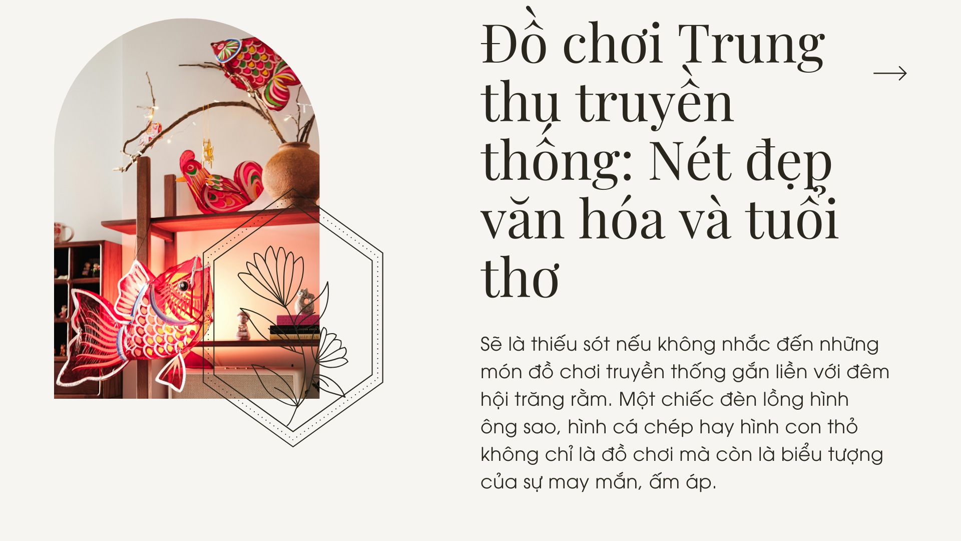 Sẽ là thiếu sót nếu không nhắc đến những món đồ chơi truyền thống gắn liền với đêm hội trăng rằm. Một chiếc đèn lồng hình ông sao, hình cá chép hay hình con thỏ không chỉ là đồ chơi mà còn là biểu tượng của sự may mắn, ấm áp.