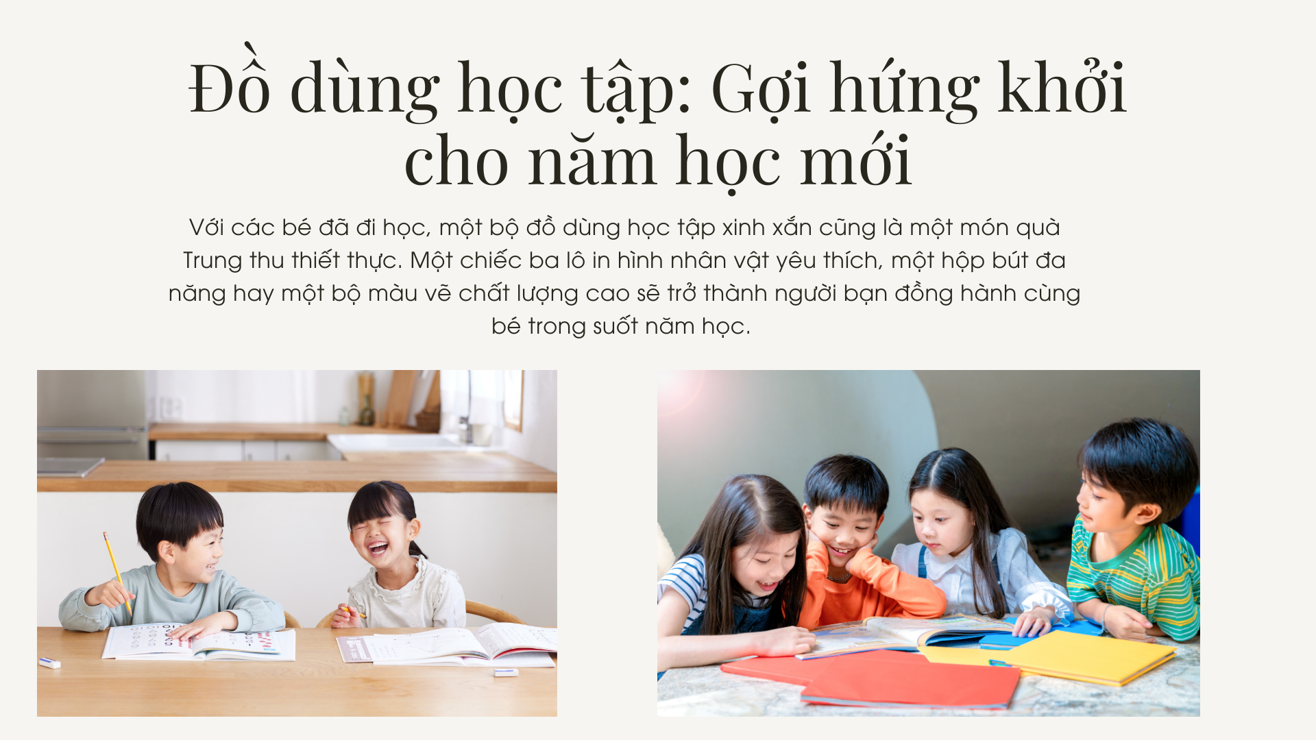Với các bé đã đi học, một bộ đồ dùng học tập xinh xắn cũng là một món quà Trung thu thiết thực. Một chiếc ba lô in hình nhân vật yêu thích, một hộp bút đa năng hay một bộ màu vẽ chất lượng cao sẽ trở thành người bạn đồng hành cùng bé trong suốt năm học.
