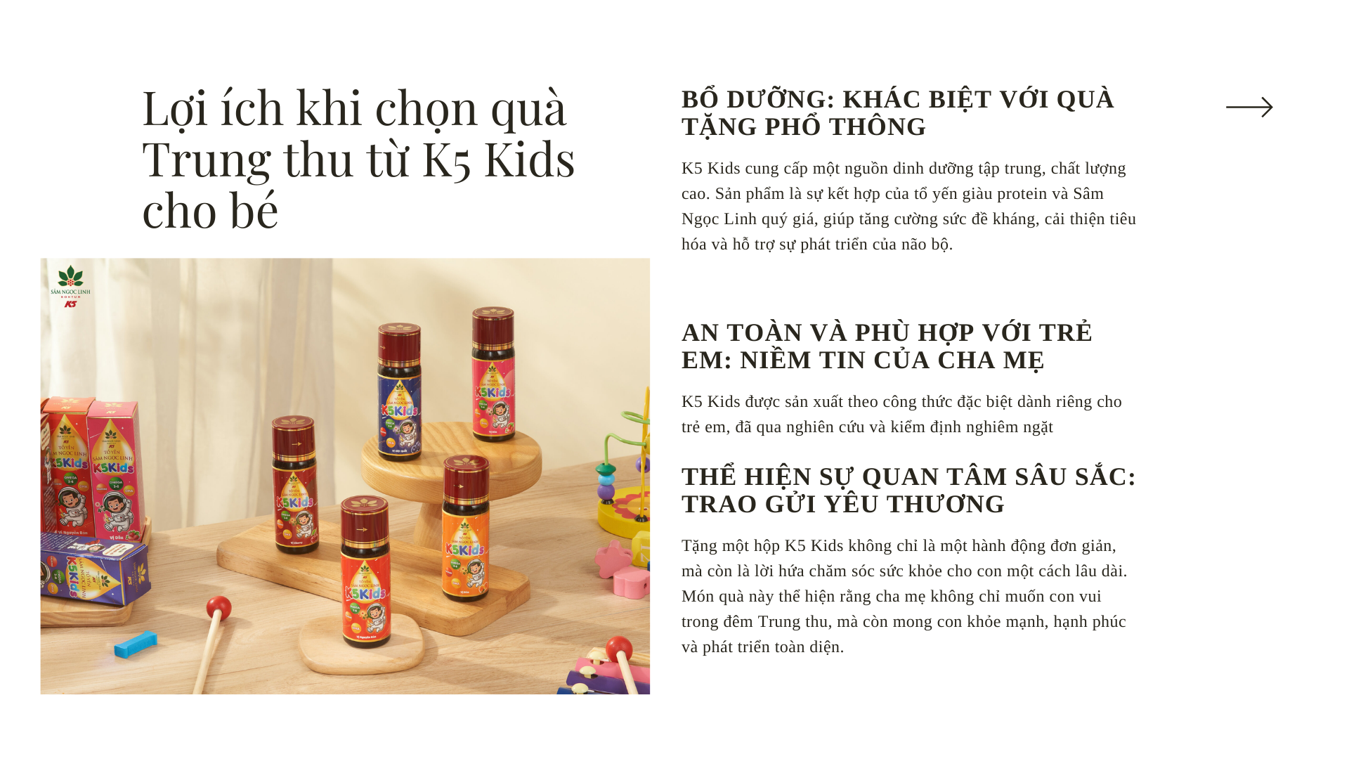 Thị trường quà tặng sức khỏe cho trẻ em rất đa dạng với sữa bột, vitamin, và ngũ cốc. Tuy nhiên, K5 Kids tạo nên sự khác biệt nhờ công thức đặc biệt, kết hợp hai loại nguyên liệu quý giá bậc nhất: