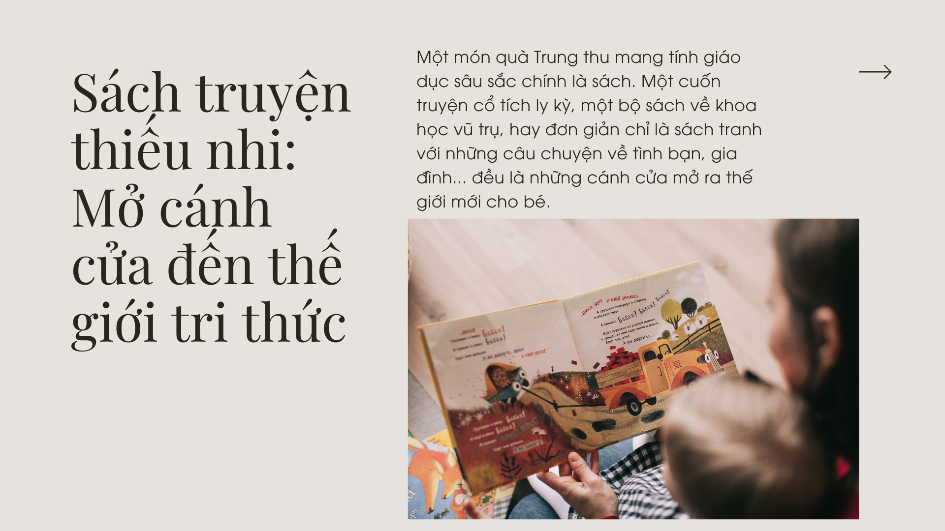 Một món quà Trung thu mang tính giáo dục sâu sắc chính là sách. Một cuốn truyện cổ tích ly kỳ, một bộ sách về khoa học vũ trụ, hay đơn giản chỉ là sách tranh với những câu chuyện về tình bạn, gia đình... đều là những cánh cửa mở ra thế giới mới cho bé.