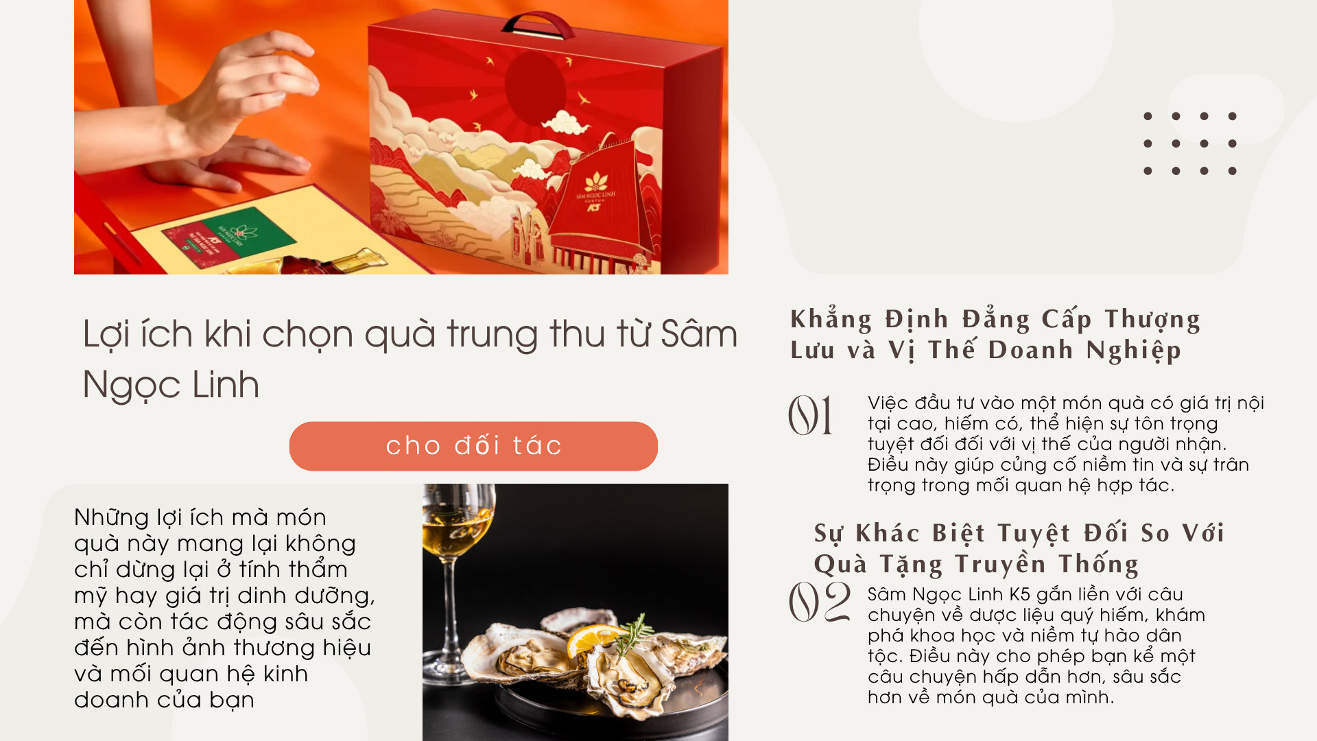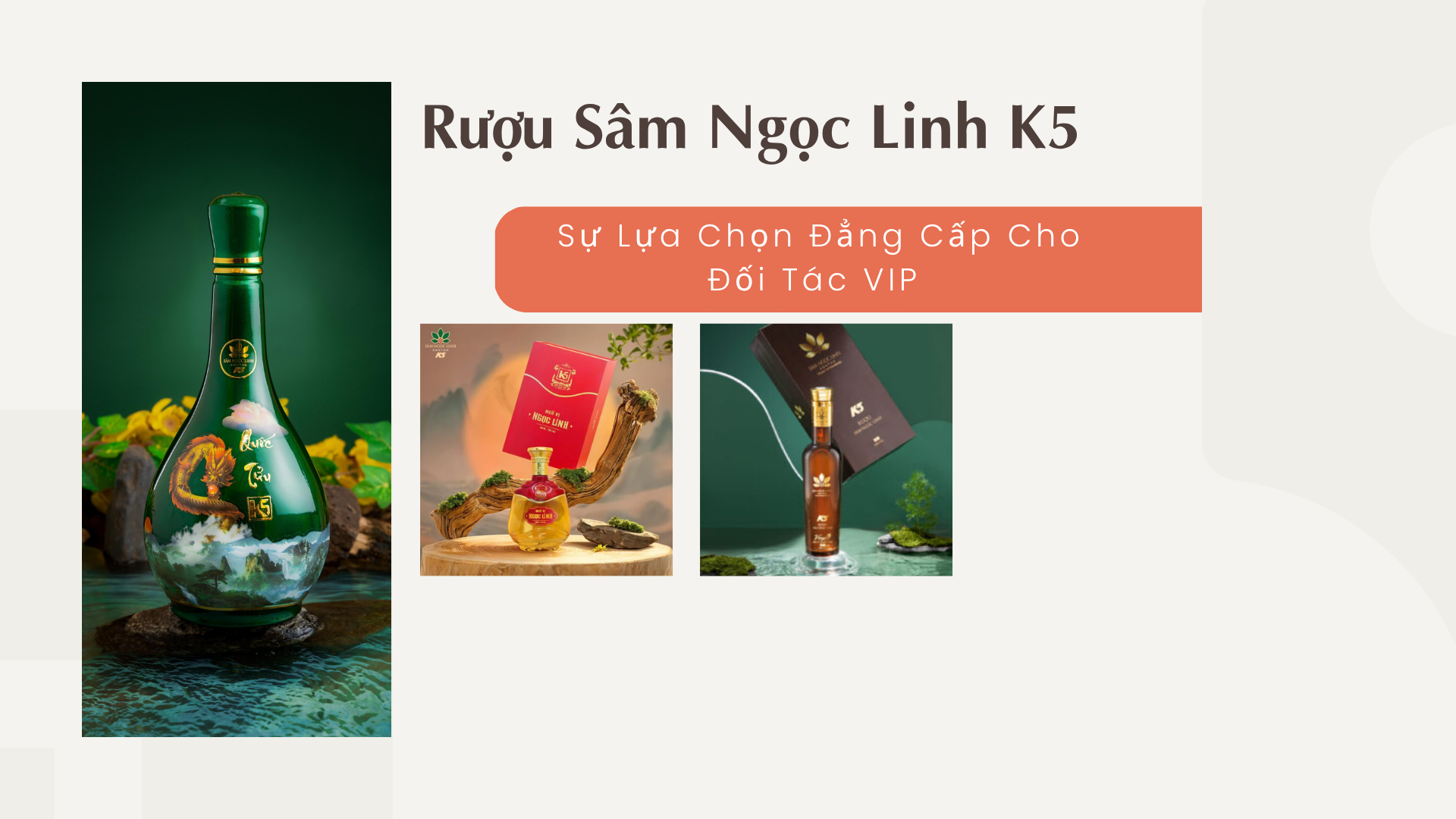 Đối tác Nam Giới/VIP: Phù hợp với các dòng Rượu Sâm Ngọc Linh K5 cao cấp (Gold, Red Label), thể hiện sự mạnh mẽ và vị thế.