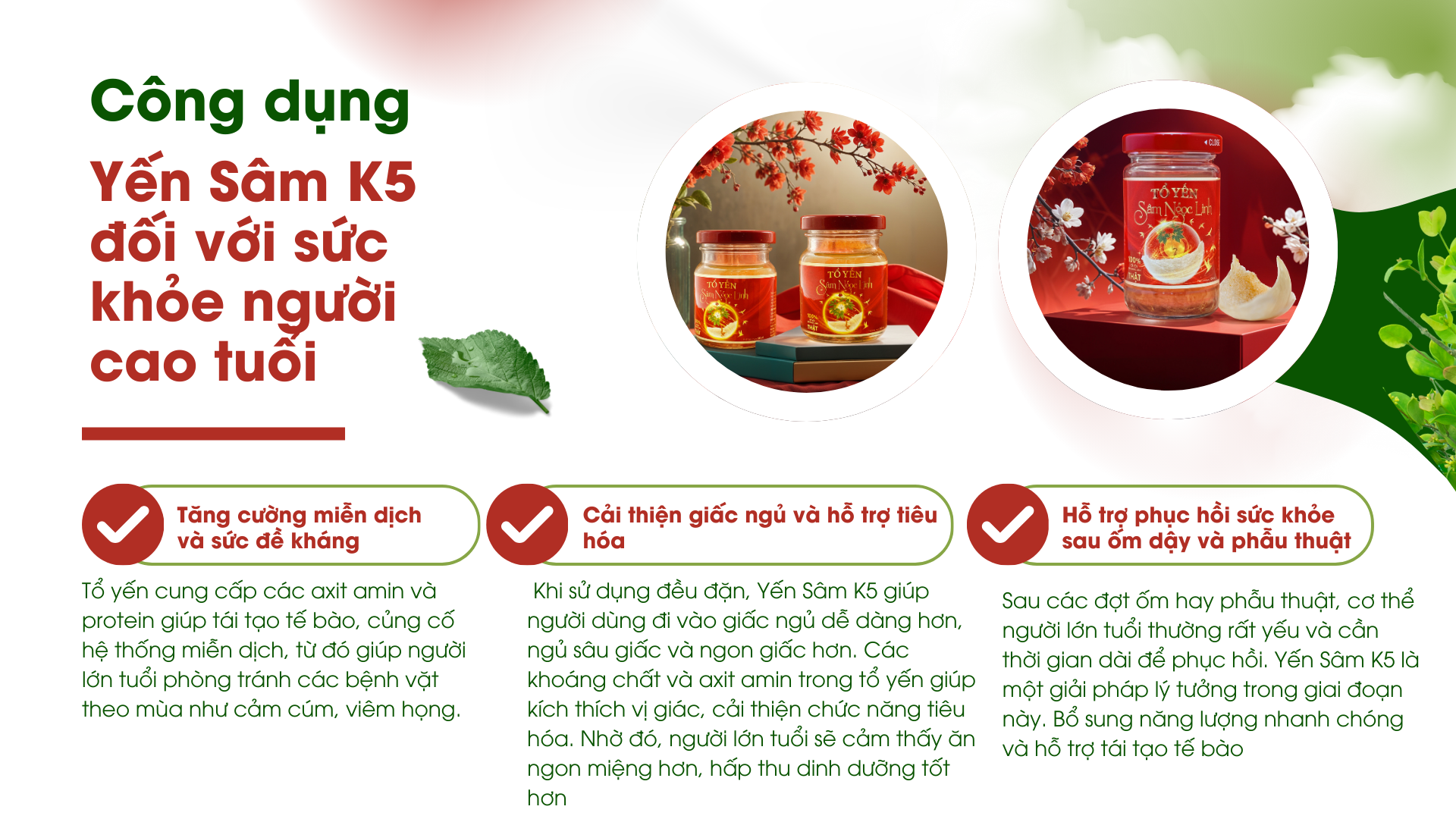 Với những công dụng đa chiều và toàn diện, Yến Sâm K5 không chỉ là một sản phẩm bồi bổ mà còn là một người bạn đồng hành tin cậy, giúp người lớn tuổi duy trì sức khỏe, sự dẻo dai và một tinh thần lạc quan, minh mẫn.