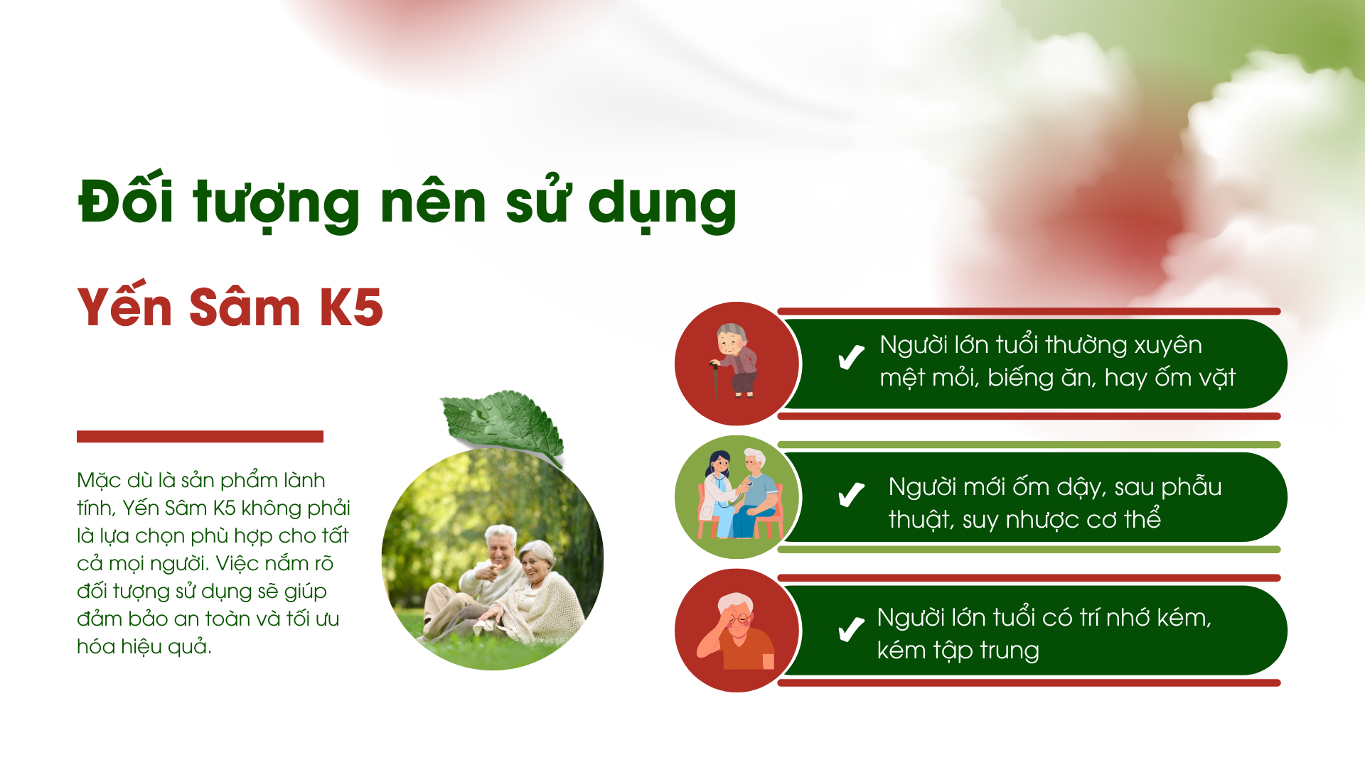 Mặc dù là sản phẩm lành tính, Yến Sâm K5 không phải là lựa chọn phù hợp cho tất cả mọi người. Việc nắm rõ đối tượng sử dụng sẽ giúp đảm bảo an toàn và tối ưu hóa hiệu quả.