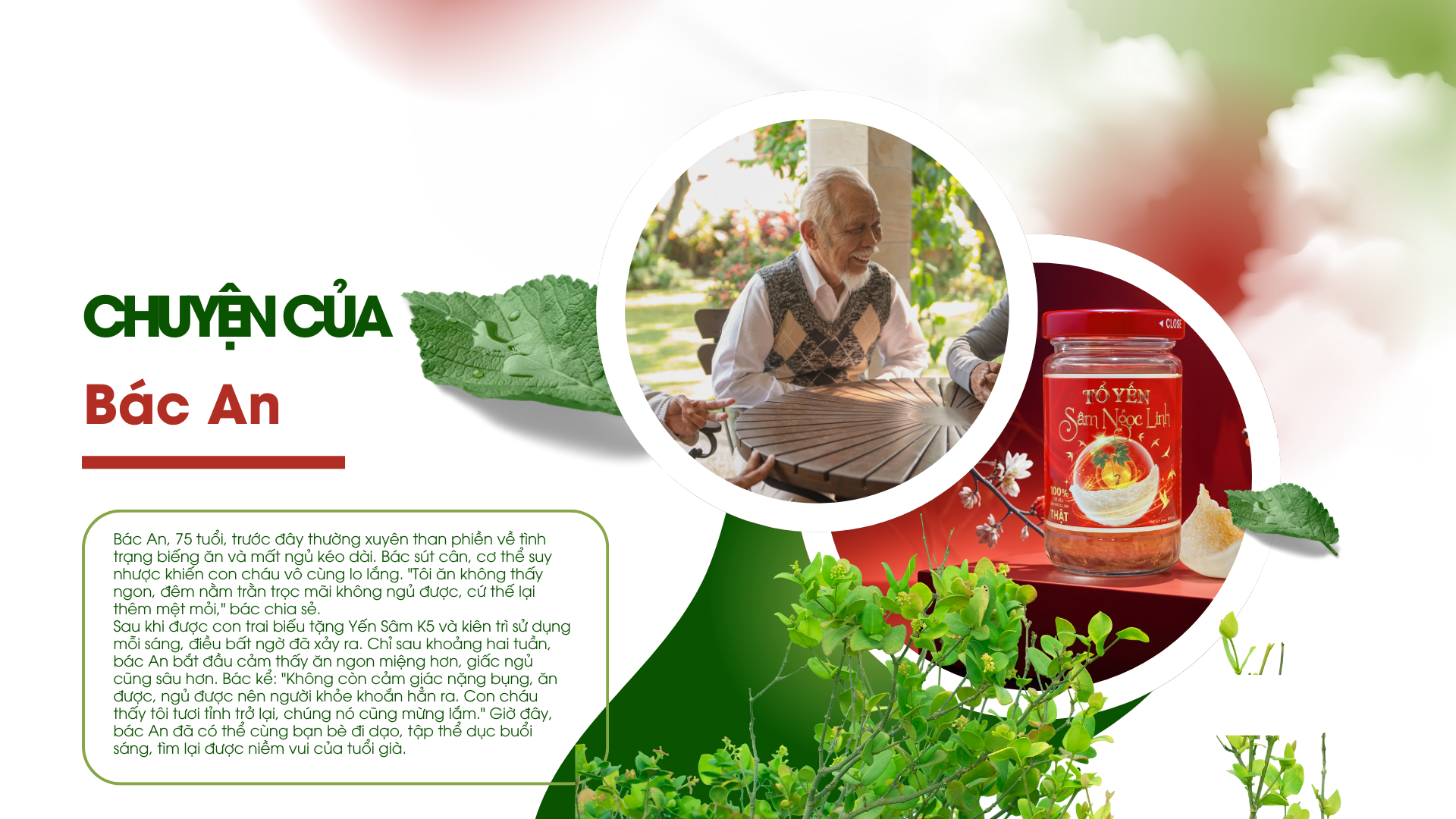 Sau khi được con trai biếu tặng Yến Sâm K5 và kiên trì sử dụng mỗi sáng, điều bất ngờ đã xảy ra. Chỉ sau khoảng hai tuần, bác An bắt đầu cảm thấy ăn ngon miệng hơn, giấc ngủ cũng sâu hơn. Bác kể: "Không còn cảm giác nặng bụng, ăn được, ngủ được nên người khỏe khoắn hẳn ra. Con cháu thấy tôi tươi tỉnh trở lại, chúng nó cũng mừng lắm." Giờ đây, bác An đã có thể cùng bạn bè đi dạo, tập thể dục buổi sáng, tìm lại được niềm vui của tuổi già.