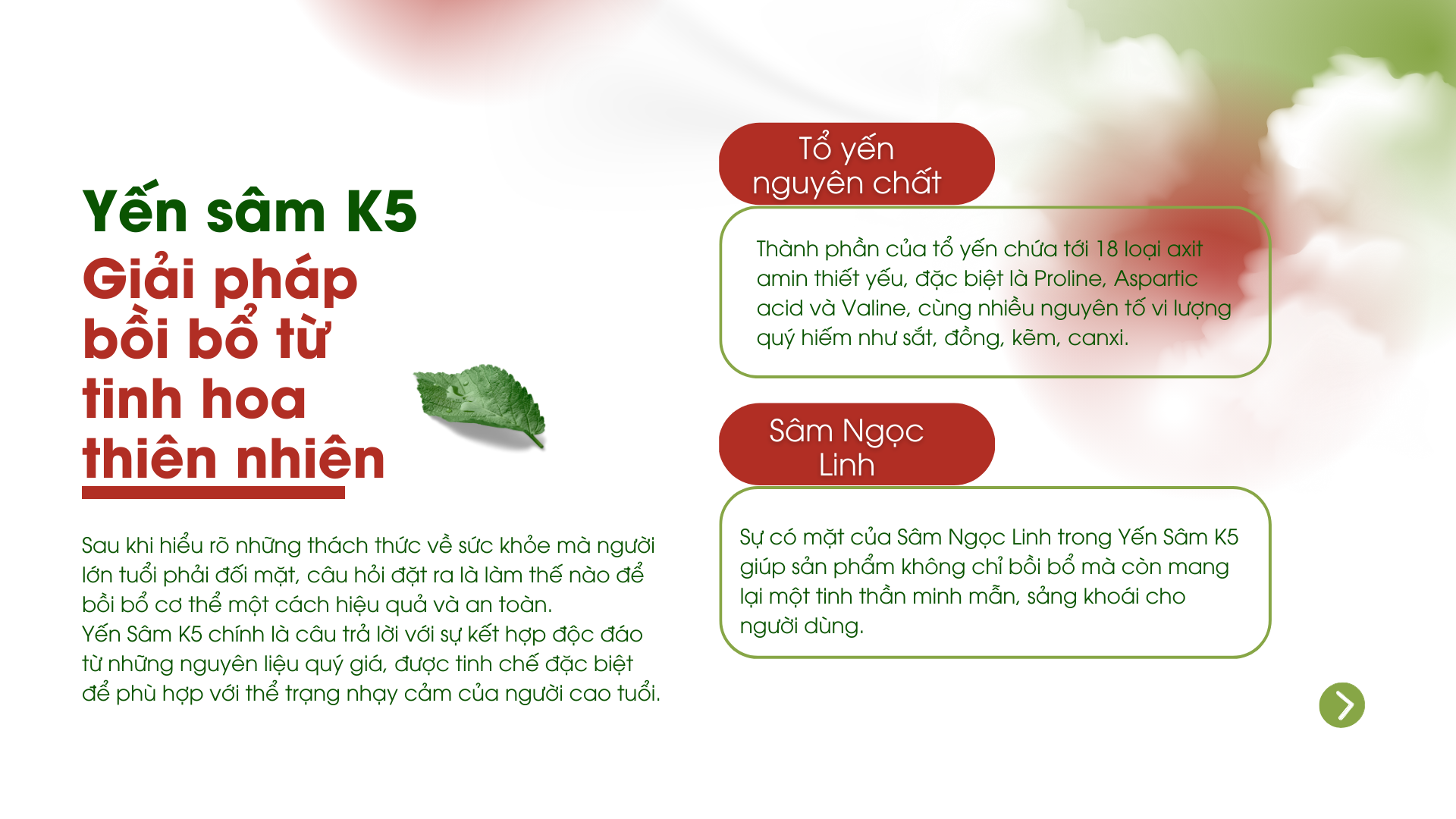 Sự có mặt của Sâm Ngọc Linh trong Yến Sâm K5 giúp sản phẩm không chỉ bồi bổ mà còn mang lại một tinh thần minh mẫn, sảng khoái cho người dùng.